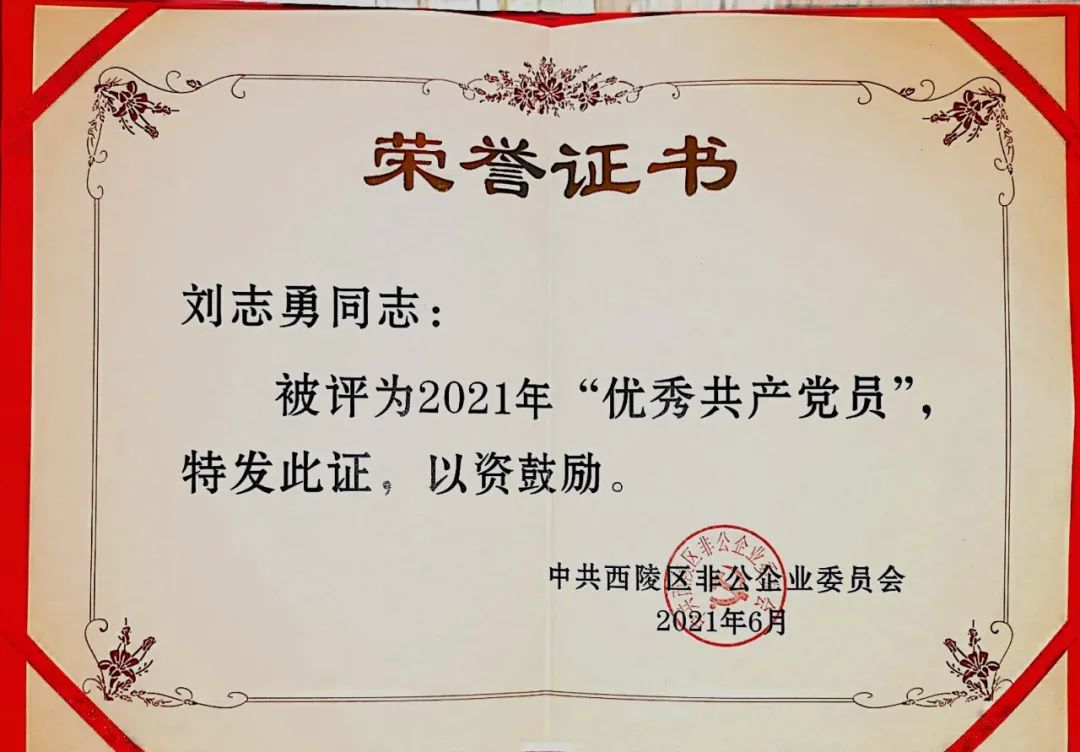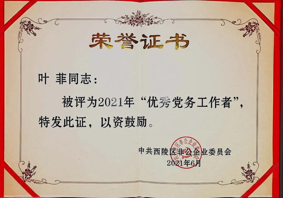 在中国共产党成立100周年之际,公司党建工作喜获三项荣誉:党支部副书记叶菲同志被西陵区非公党委授予“优秀党务工作者”称号;党员刘志勇被西陵区非公党委授予“优秀共产党员”称号;公司党支部被中共宜昌市西陵区委员会授予“先进基层党组织”称号。