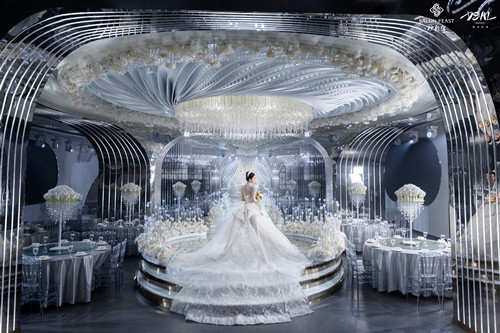 沙龙宴宴会定制中心是一个水晶般的梦境世界,一个繁星璀璨的艺术殿堂,是梦想成真的地方,是浪漫与美好的交织。 绚丽的舞台、奢华的水晶,闪耀全场、美轮美奂,每一处都彰显着品质与尊贵。